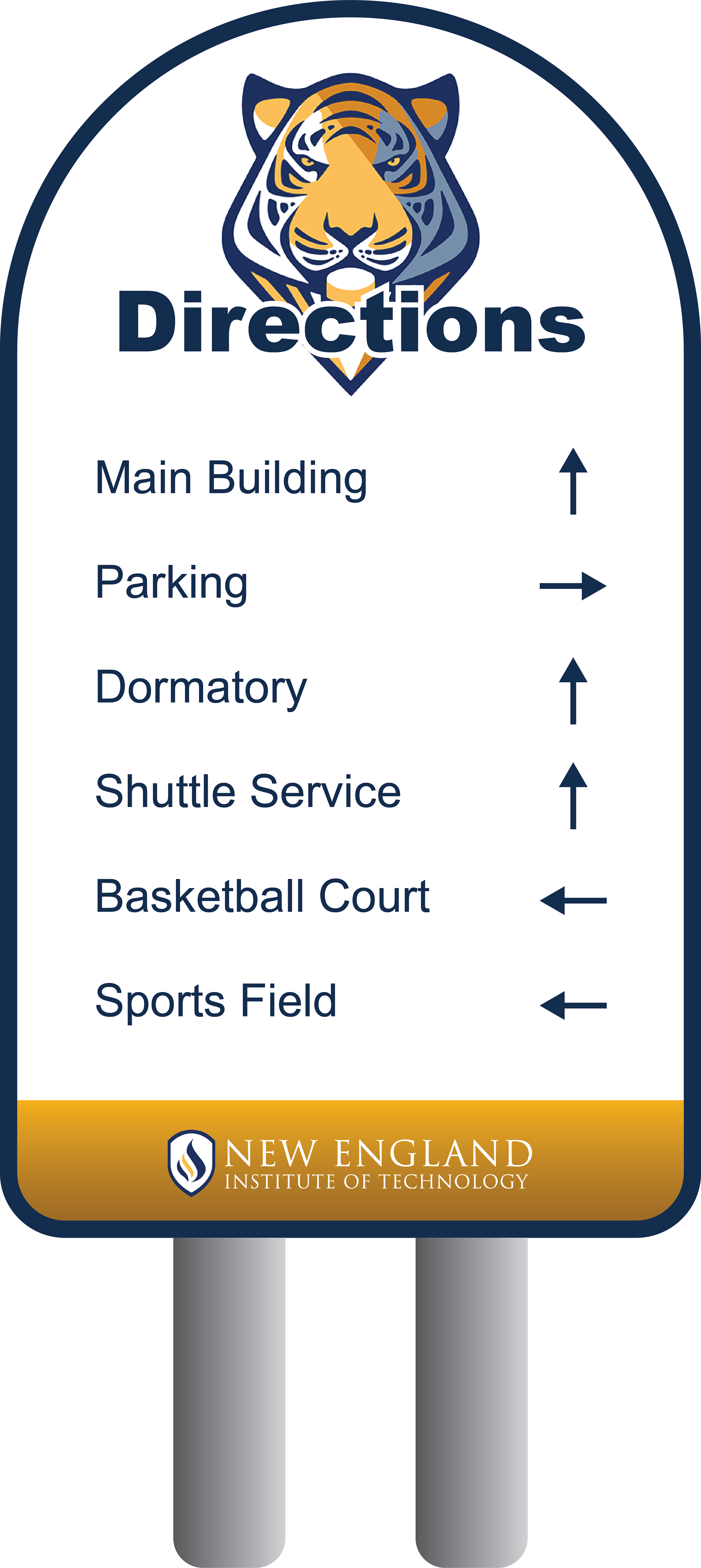 A directional sign located by the rotary to guide drivers to their destination, featuring the New England Tech mascot: Techie the Tiger.